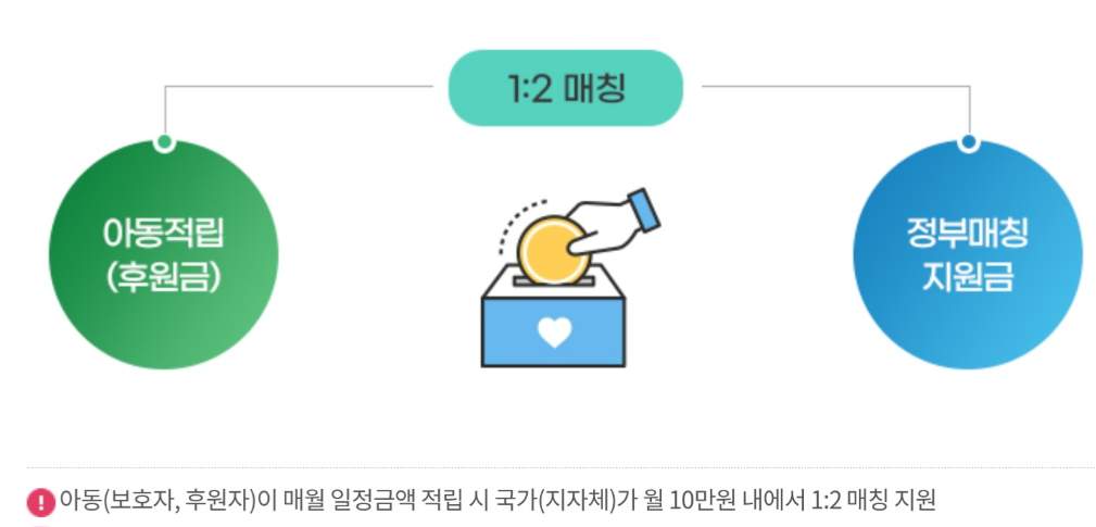 아동이 후원자 또는 보호자의 도움 등으로 적립 시 월 5만 원 내의 범위에서 1:2로 매칭하여 국가(지자체)가 월 10만원 내 지원합니다.